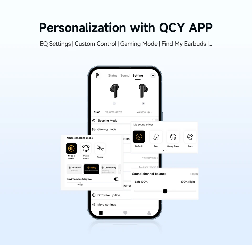 Designed for diverse music genres, 6 studio-grade preset EQs deliver optimal sound for everything from rock to classical. Find the perfect settings to enhance your playlist in the QCY app.