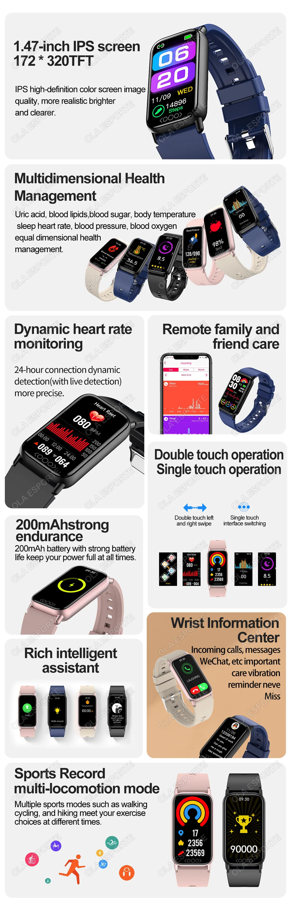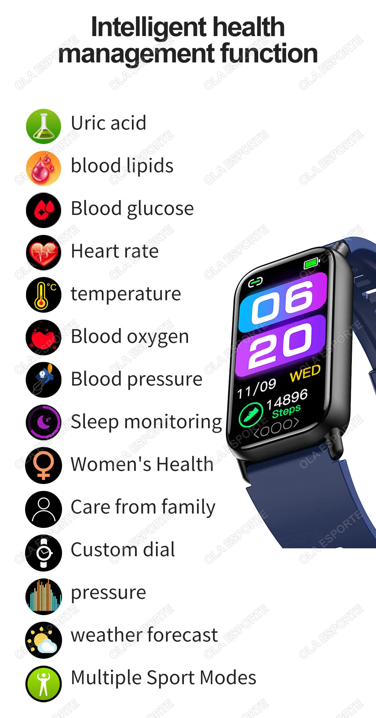 Funções: Pedômetro, rastreador de fitness, monitor de sono, lembrete de mensagens, lembrete de chamadas, atender chamadas, fazer chamadas, controle remoto, envio de mensagens, cronômetro, alarme, contador de calorias, janela de perspectiva, monitor de frequência cardíaca, música interativa, contagem regressiva, oxímetro